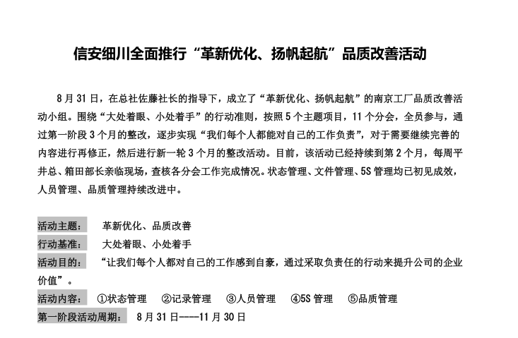 信安細川全面推行“革新優化、揚帆起航”質量改善活動