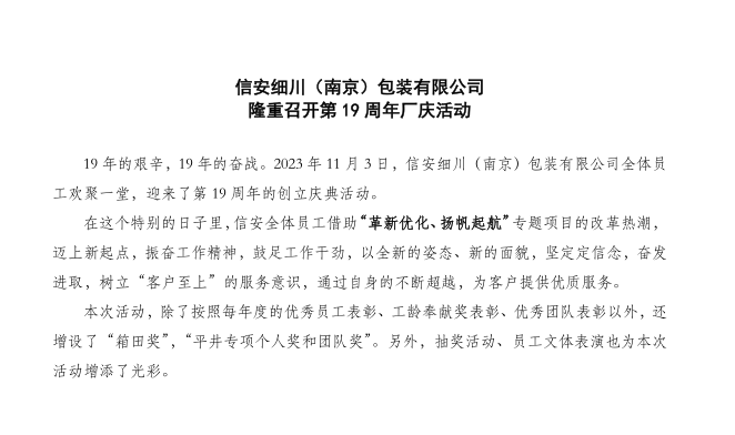 信安細川(南京)包裝有限公司隆重召開19周年廠慶活動